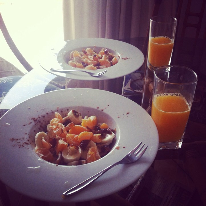 That fruit-breakfast tasted heavenly. Bananas…appels..with a bit of cinnamon…some dates…a sweetness so nice….And later I had my first coffee after ten days. Hello friend! Missed you. Pure joy… Like an exploring child…A walnut…? Never knew it tastes thát good!