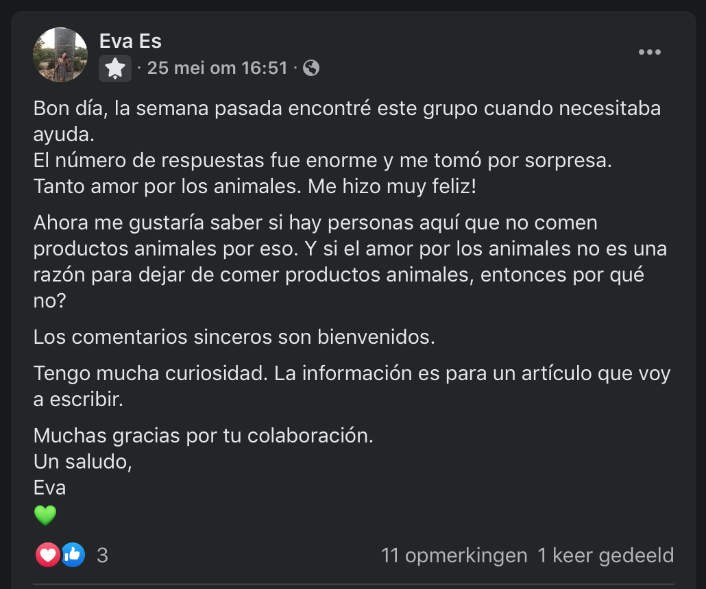 A member answers in detail that to her it is important to have laws that prohibit the exploitation of animals, the abuse and painful deaths. People are free to choose if they want to eat animals or not, and they should not be judged. She eats chicken and beef, and bacon, and some fish. Rabbit no, because it could be a pet, she says. One time she witnessed the slaughter of a goat, and since then she dislikes the taste of lamb and goat cheese in her mouth, so she stopped eating this.