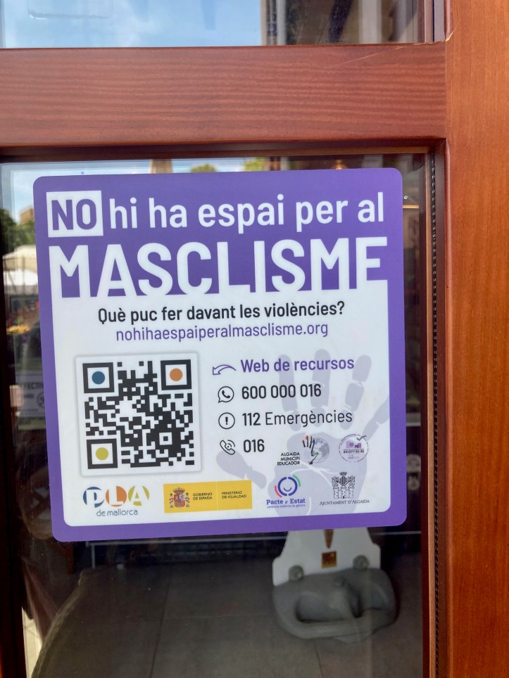 For a while now, I have been seeing purple signs on Mallorca, where I live. At schools, cafes, restaurants, in all kinds of public places. Every village has these purple signs stating that there is no place for ‘machismo’ (‘masclisme’ in Catalan, the first language on Mallorca).