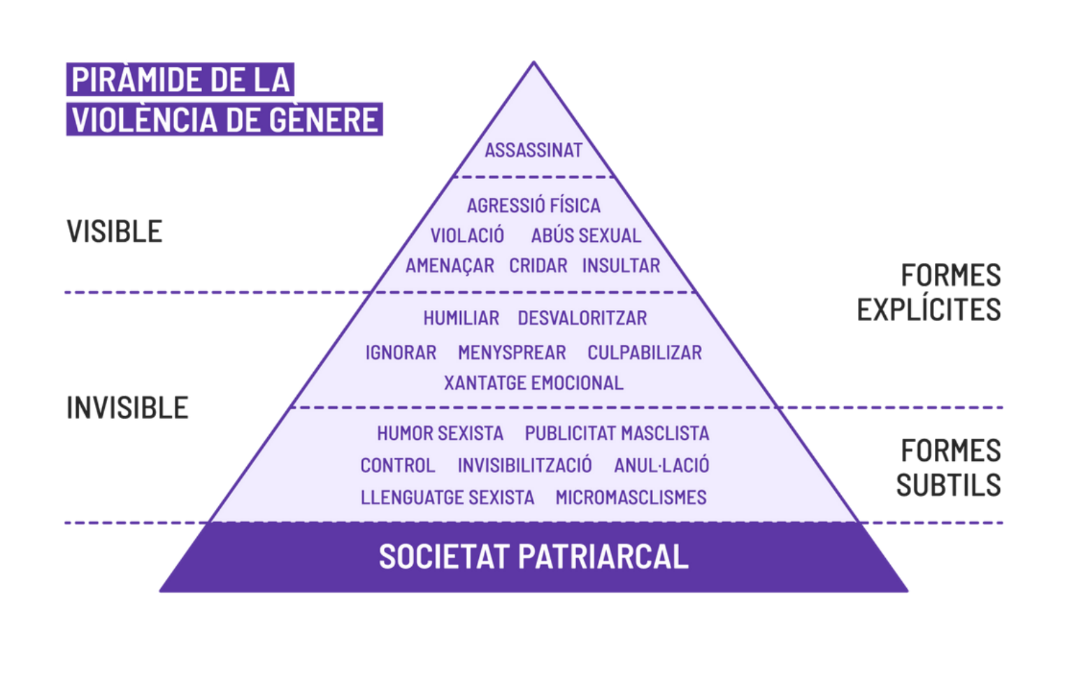 Violencia machista thus goes from subtle, invisible, to more explicit and visible violence. This is the so-called pyramid of violence against women, which is deeply embedded in a patriarchal society. Other serious forms of violence against women include human trafficking and genetic mutilation.