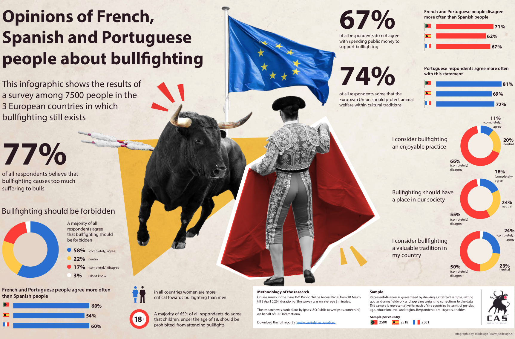 A recent survey on behalf of CAS International among 7500 citizens of Spain, Portugal and France, the three European countries where bullfights are still allowed, demonstrates some interesting insights. A majority of 77% of all respondents believe that bullfighting causes too much suffering to bulls, 14% is neutral and 6% disagrees with the statement. A majority of 58% of all respondents agree that bullfighting should be forbidden, 22% is neutral about it and 17% disagrees. French and Portuguese respondents (both 60%) agree more often than Spanish respondents (54%).