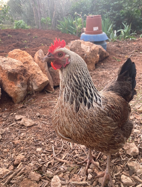 We hadden elf kippen achterin op ons land wonen. Sidonia, die het weigert tussen de anderen te leven en volledig haar eigen gang gaat, heeft de rest van het land tot haar beschikking. ’s Ochtends staat ze te kakelen voor de deur, want dan is het tijd voor haar zaden-ontbijt. Ze heeft inmiddels wel wat van de broccoli-plantjes opgegeten in de groentetuin, maar goed, we zien het door de vingers.